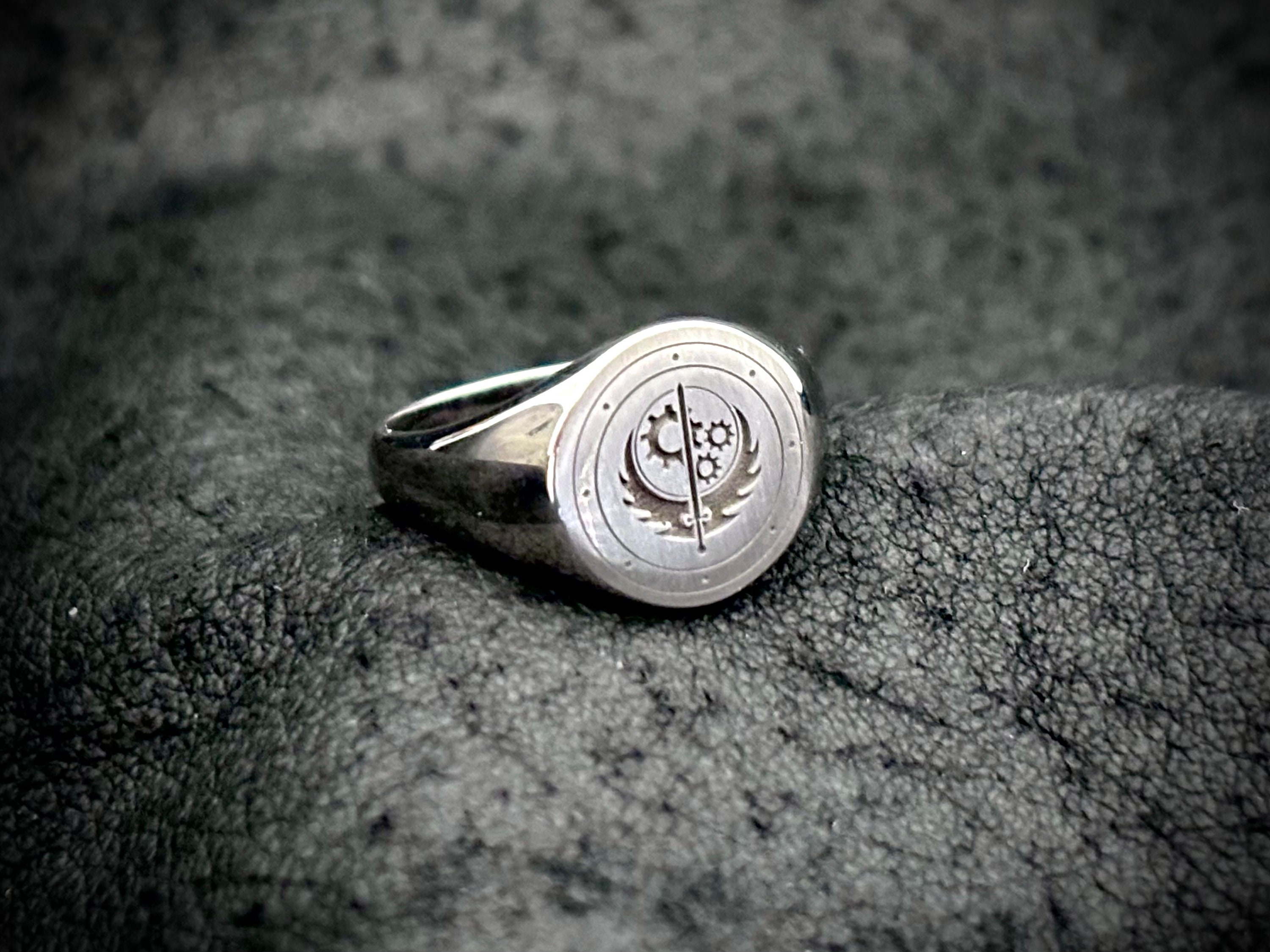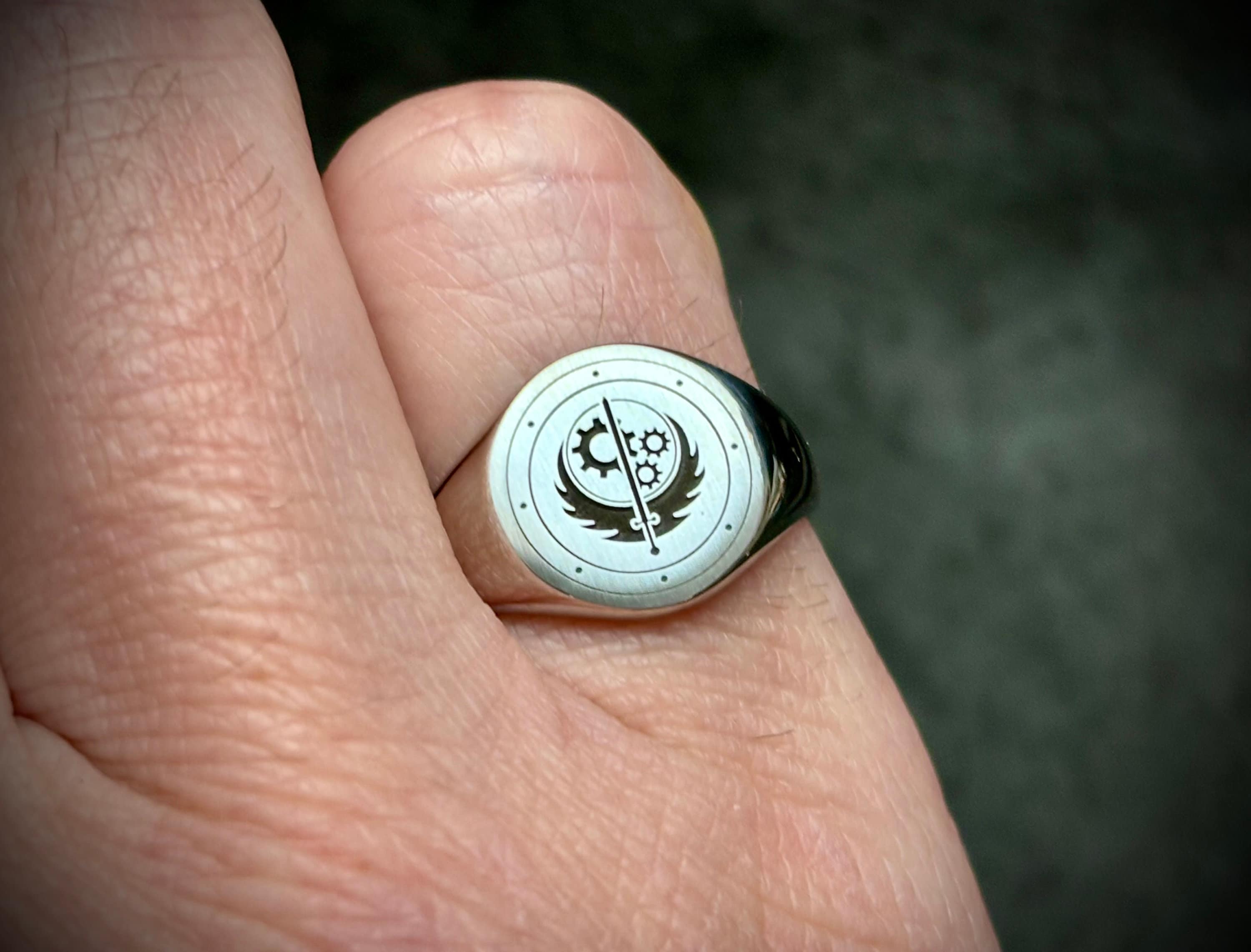 Introducing a unique piece of jewelry crafted with utmost care and attention to detail. This sterling silver ring, made from .925 Sterling silver, features the Brotherhood of Steel emblem